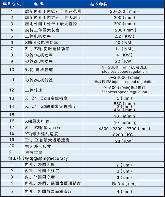 ● 本機(jī)床為三軸(X工件橫向進(jìn)給、Z1、Z2砂輪縱向運(yùn)動(dòng))二聯(lián)動(dòng)套筒及主軸專用數(shù)控磨床,主要用于磨削各類主軸及套筒的內(nèi)孔、內(nèi)錐孔、內(nèi)端面、外圓、外錐面、外端面。磨削循環(huán)均自動(dòng)完成(具有自動(dòng)進(jìn)刀、退刀、粗磨、精磨;自動(dòng)修正砂輪、自動(dòng)補(bǔ)償?shù)裙δ?。